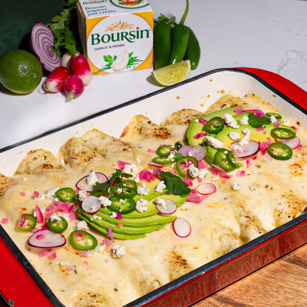 Cheesy Boursin enchilada sauce covers tortillas wrapped up with more Boursin, spiced chicken, and veggies. Finished with fresh herbs, chillies, and avocado, this is a super fresh but indulgent recipe.