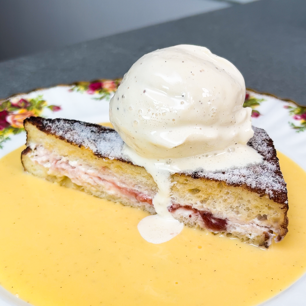Standing next to my grandad in his red, green and chrome Formica kitchen, Dennis Jelley, the man that (on a separate occasion) taught me the importance of saving a Yorkshire pudding for after dinner, to dip into golden syrup whilst doing the washing up. 7 year old me, chewing on a crust watching as he flips a soggy jam sandwich in spitting fat, poised for the quick ready steady go of steaming hot custard poured over a huge scoop of vanilla ice cream, begging for the fried sandwich to be plunged into its frothing melting hot cold wonder. There’s something of the fresh fairground doughnut in this historic pudding. Concentrated nostalgia.