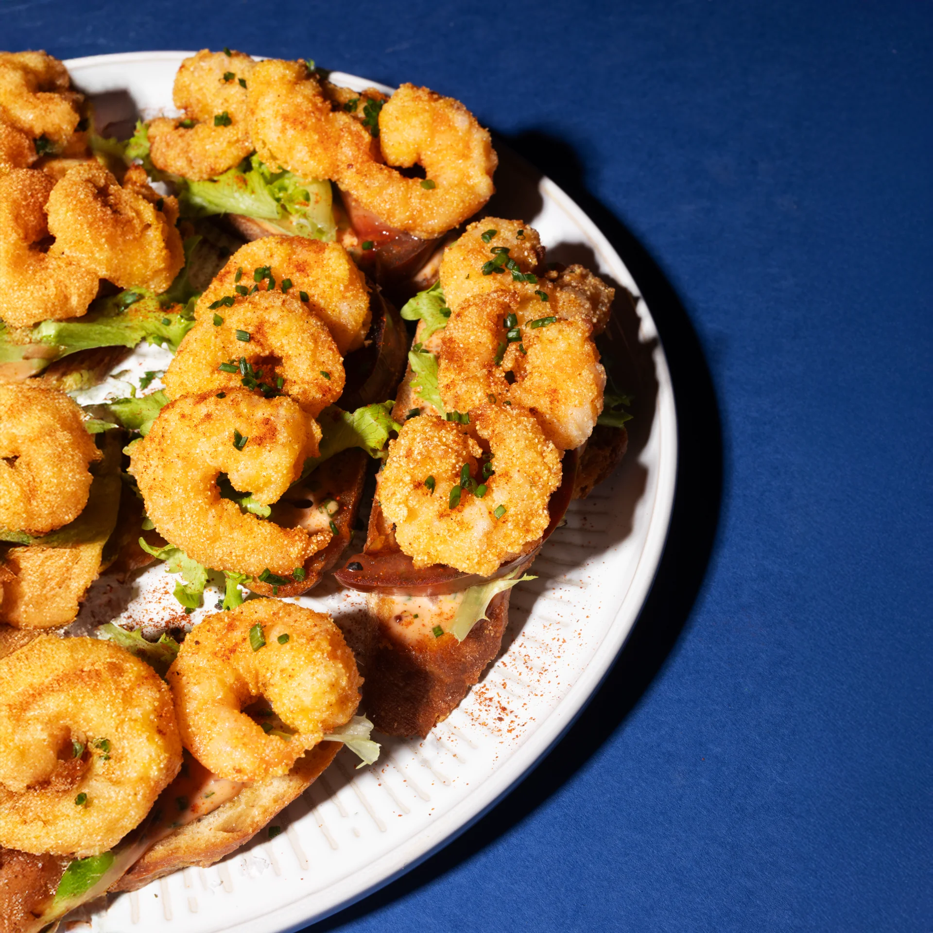 To build the crostini, start with a good spoonful of the remoulade on the baguette. Top with a piece of lettuce and tomato, then a few of your fried prawns. Finish with chives, and dig in!