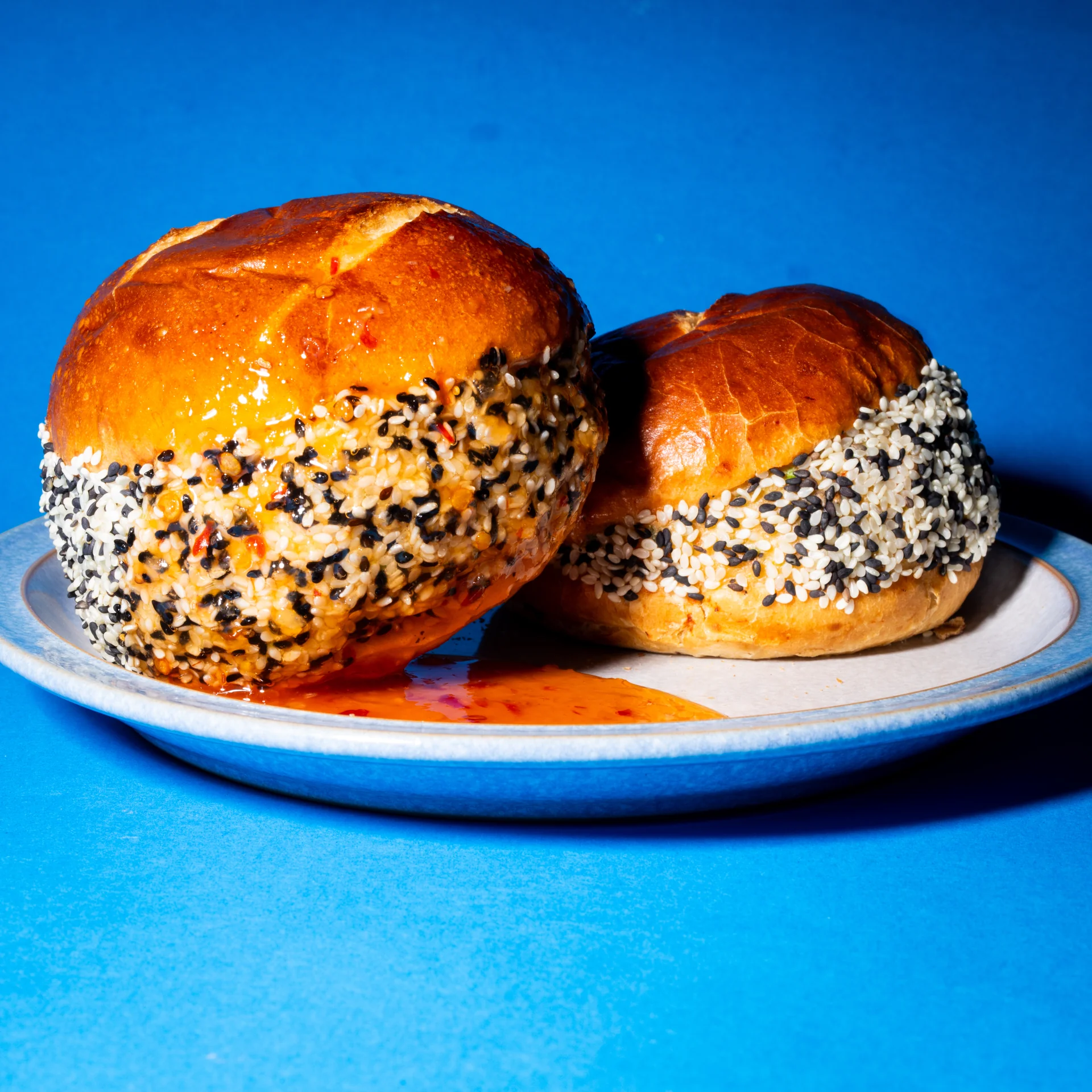 It may not be one of life's biggest questions, but we've answered it with our stuffed prawn toast buns. These are basically just brioche buns cut almost the whole way through and then stuffed with prawn toast mix, rolled in sesame seeds. So simple, so good, so damn easy. You can use an air fryer for these, too.