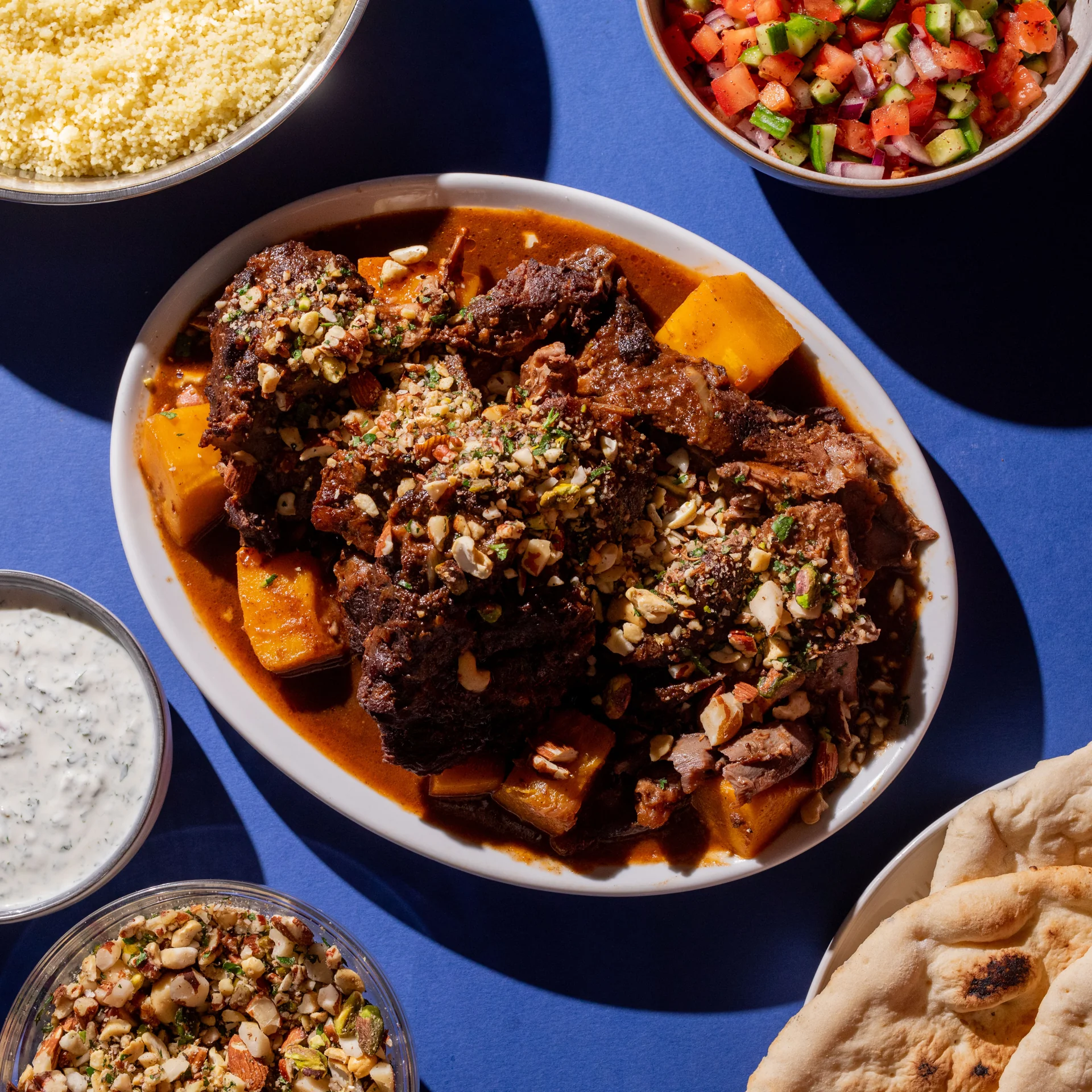 Once the meat is cooked, remove from the cooking liquid, and if possible, remove the pumpkins. On the hob reduce the sauce slightly, before pouring on a platter, adding the lamb on top, dressing with dukkah and herbs