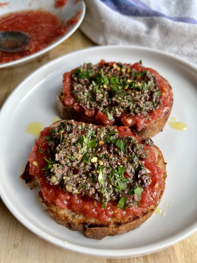 • Toast the bread or gently fry in some olive oil until golden brown. Brush each slice with garlic then load on the grated tomato (aim for the less watery bits) then top with the olive tapenade. Garnish with parsley and chilli flakes. Serve up and enjoy!