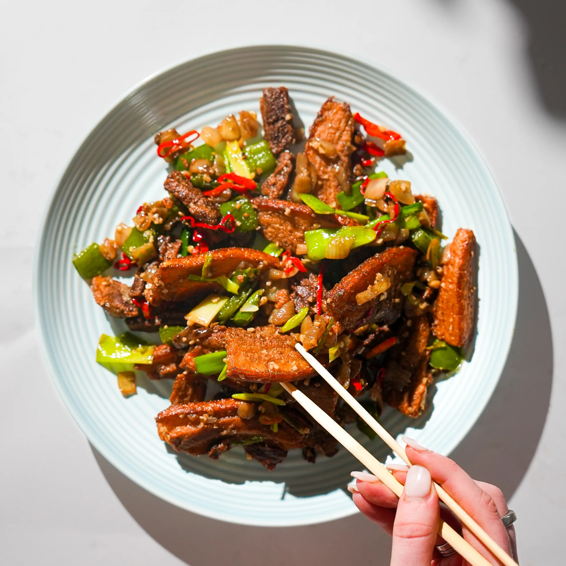 Crunchy pork belly chicharrones are stir fried in a spicy Chinese inspired blend of spices and veggies for the ultimate fusion dish!