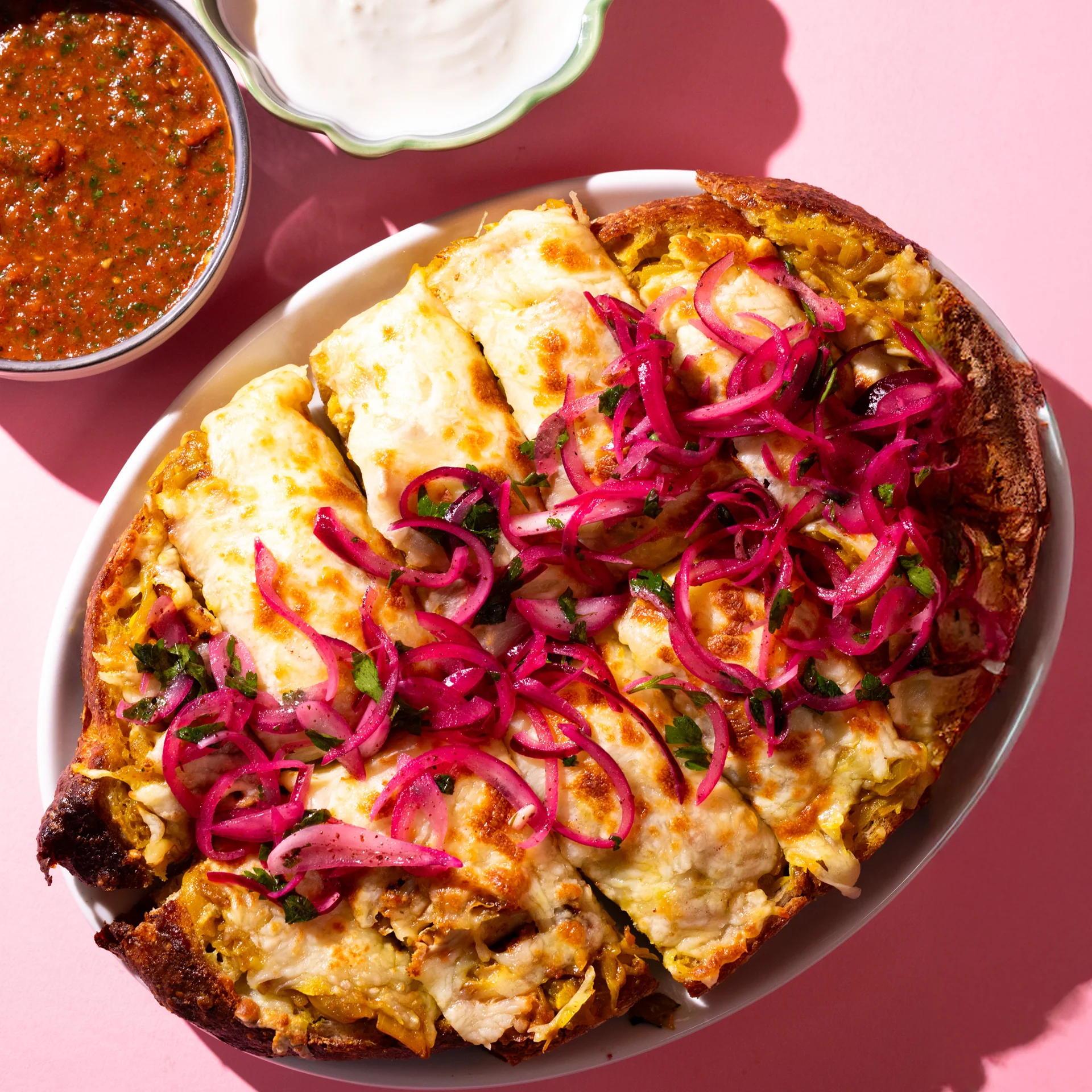 The perfect way to use up your onions. Caramelised onions spiced with shawarma seasonings, and a red onion sumac salad, all on top of a giant cheese on toast... oh and did we mention the shawarma meat hidden underneath?!