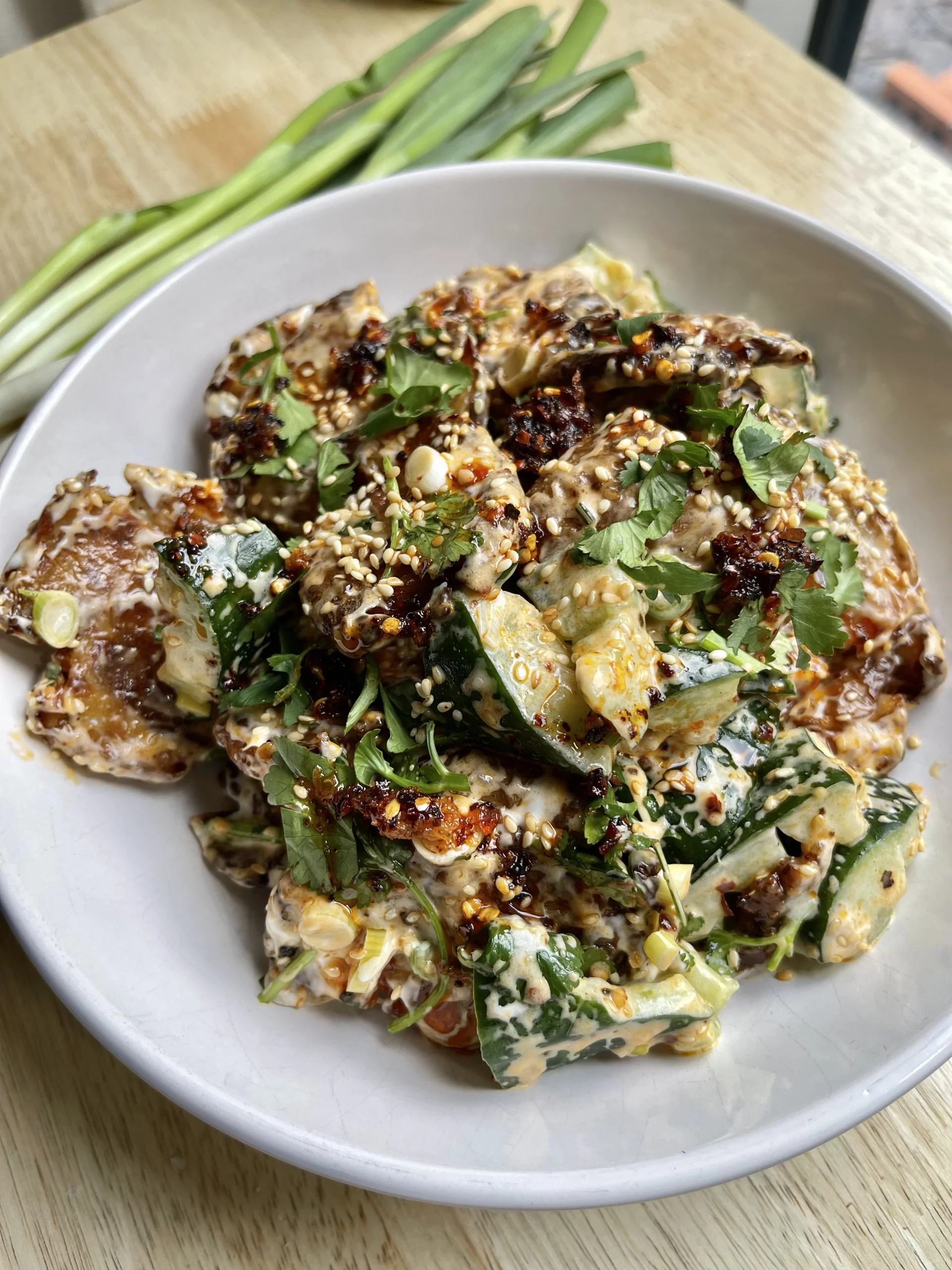 Drain the cucumber juice, pat the pieces dry and add to a bowl with the spring onions, coriander and potatoes. Mix the mayo with the black vinegar then add to the potatoes with the chilli crisp oil and sesame seeds. Serve immediately and enjoy!