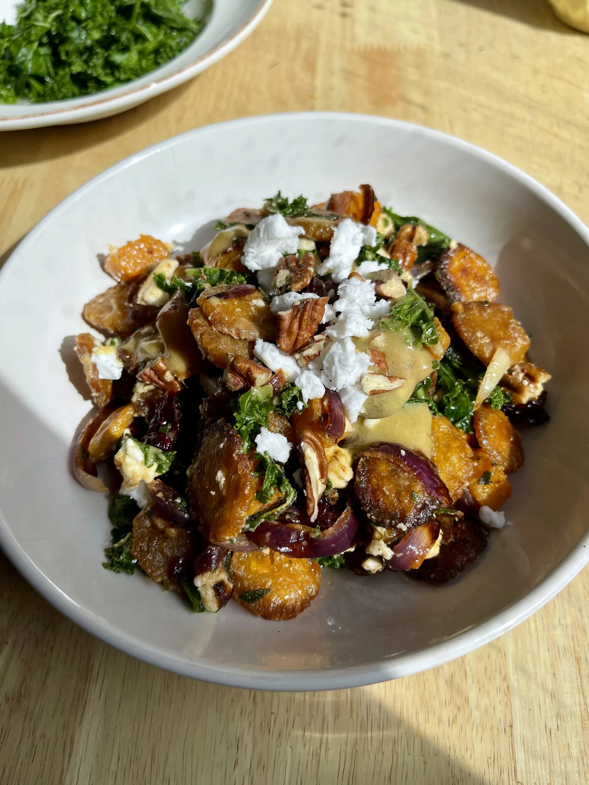 If you loved our first smashed gnocchi salad, you'll love this autumnal version with kale, pumpkin gnocchi, pecans, crumbled feta, roasted squash and onions and a balsamic dressing.
