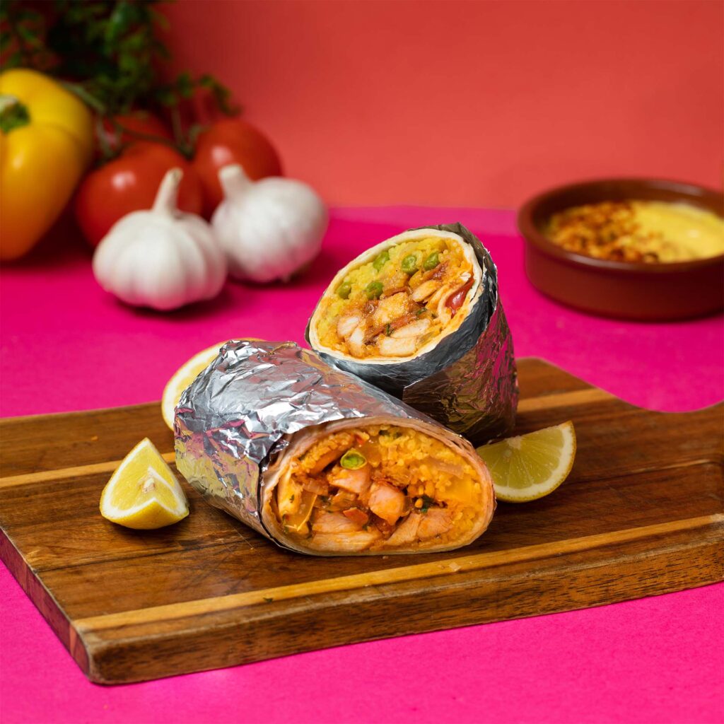 This burrito is inspired by one of Spain's most iconic dishes, paella. We've got saffron infused rice, smokey spicy chicken, chorizo, and prawns, a lemony tomato salsa, and a saffron aioli, all wrapped up in a tortilla.