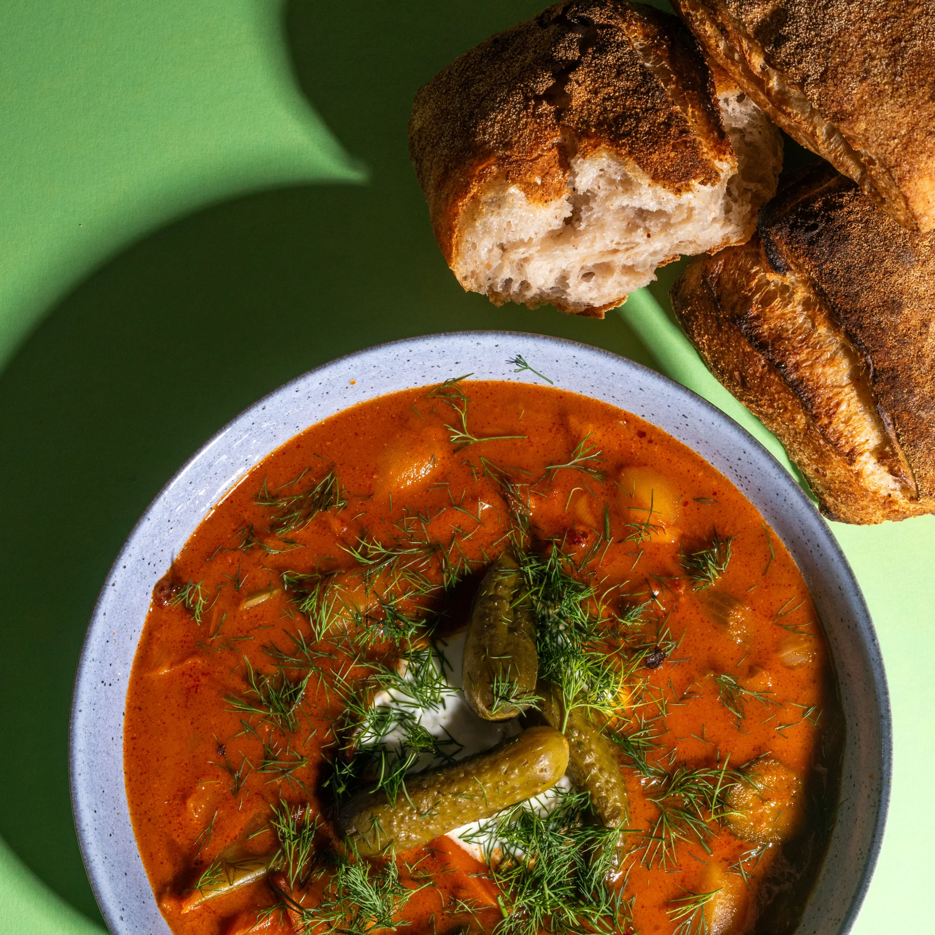 Serve the soup with blobs of sour cream, the bacon, more pickles on top and shed loads of dill.