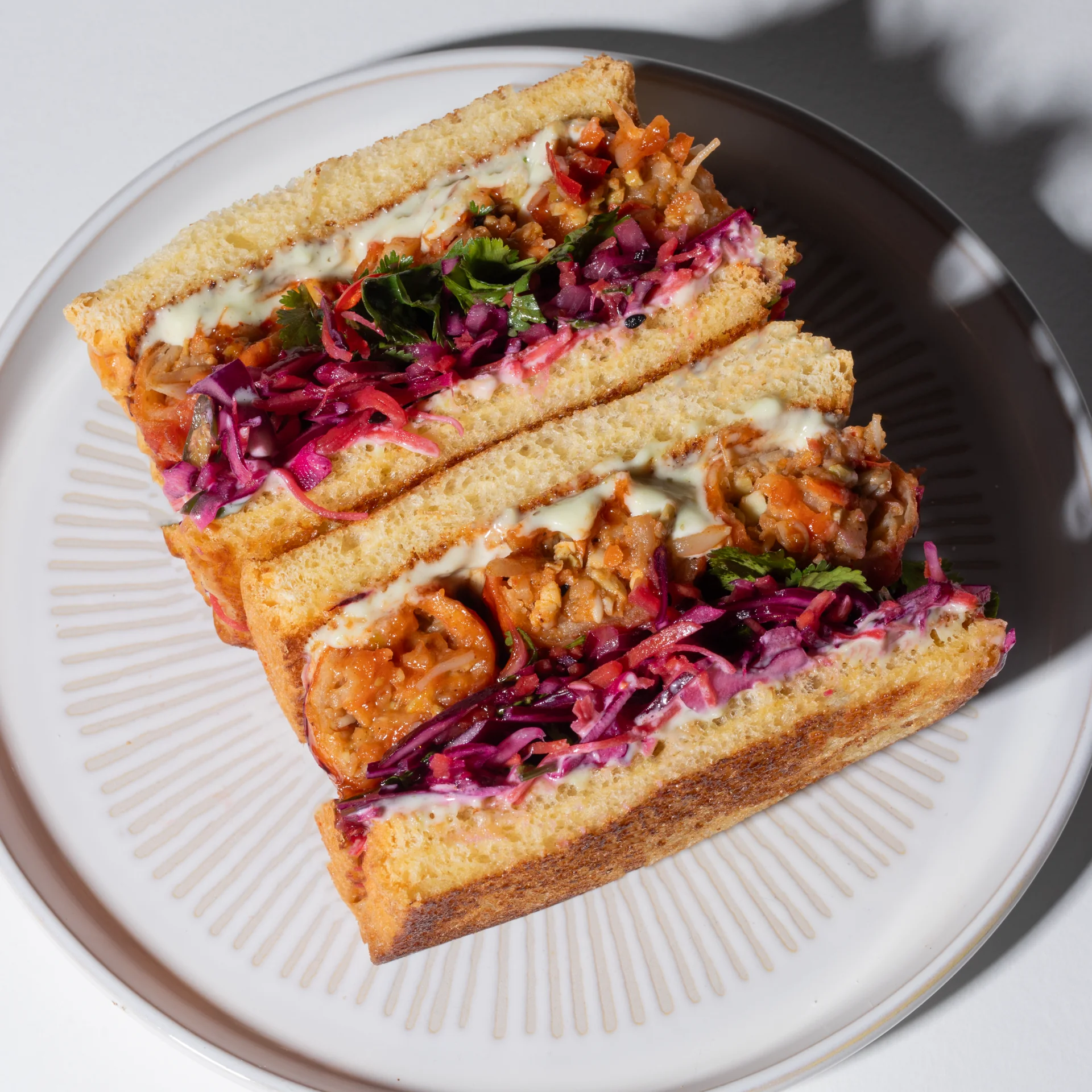 Toast the brioche, and start assembling with our tartar sauce, then a generous spoonful of coleslaw, our crispy spring rolls and some of that sriracha honey. A little more tartar on the top slice of bread and close. Slice and serve with a dusting of furikake for more umami deliciousness!
