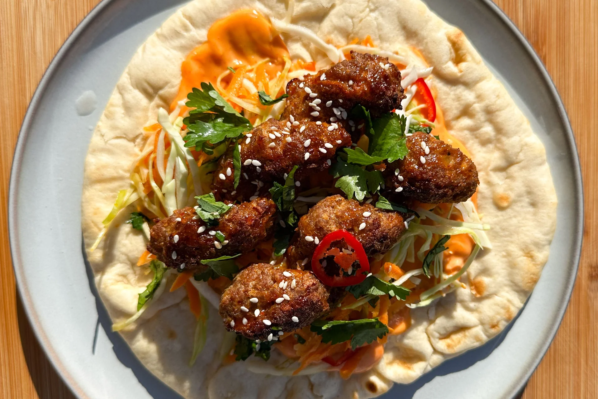Warm flatbreads, spread with sriracha mayo, pile on the slaw, top with turkey twizzlers, drizzle with extra glaze, and finish with coriander and spring onions.