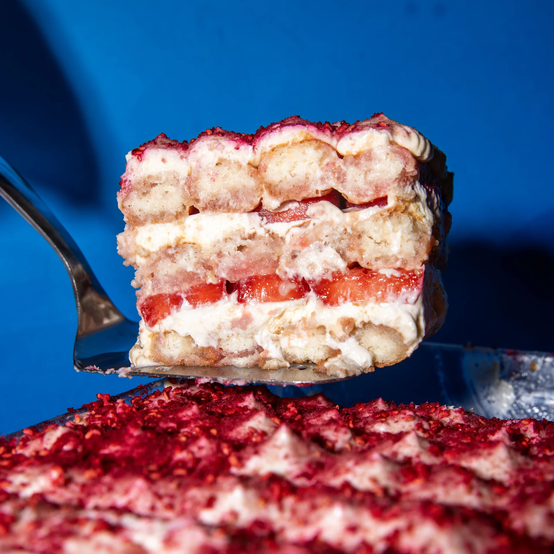 Spread a third of the mixture over the soggy fingers, then top with halved strawberries. Repeat, until you have three layers of biscuits.