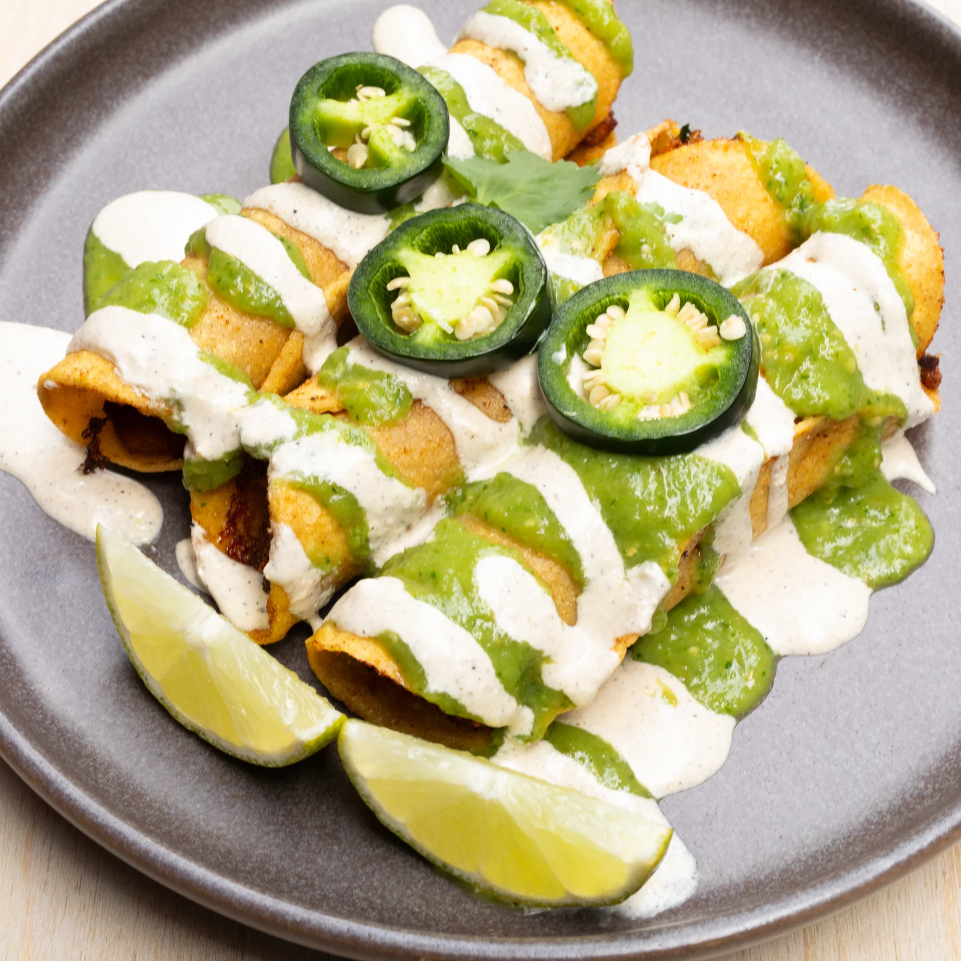 When you come to serve, fry the flautas either in a frying pan with a deep fryer until golden and crispy, cover with the crema and serve with lime and fresh coriander.