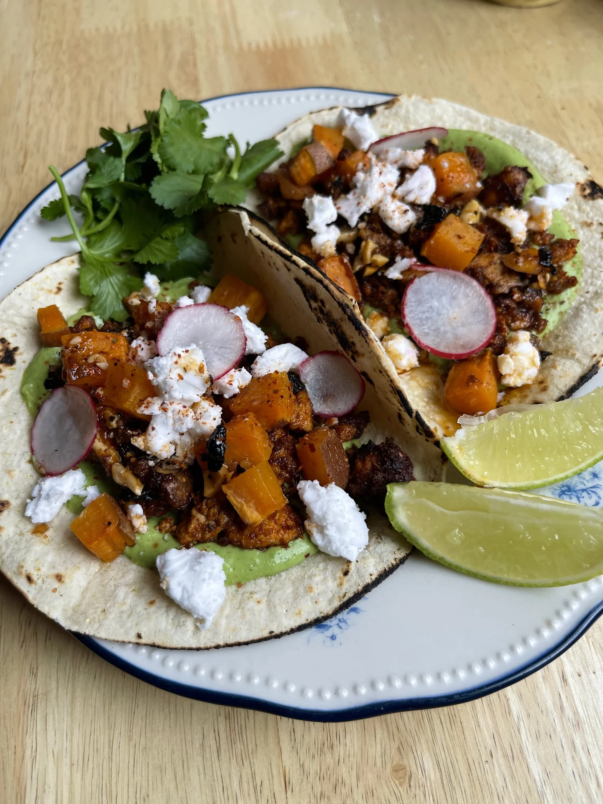 Top the corn tortillas with the avocado crema, tofu chorizo and sweet potatoes. Garnish with radishes, vegan feta and a hot sauce of choice. Squeeze over more lime juice then enjoy!