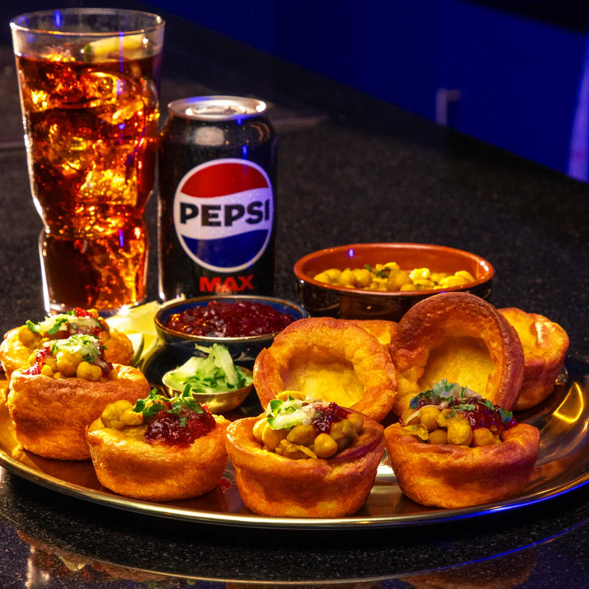 Trini doubles are a staple of Caribbean street food. They're of full of big flavour and garnished with delicious toppings with bring them all together. The traditional light, doughy bara (fried flatbread) gets subbed out for vegan yorkshire puddings which are crispy and make a delightful little edible bowls to pop all the fillings into. Perfect with a Pepsi Max!