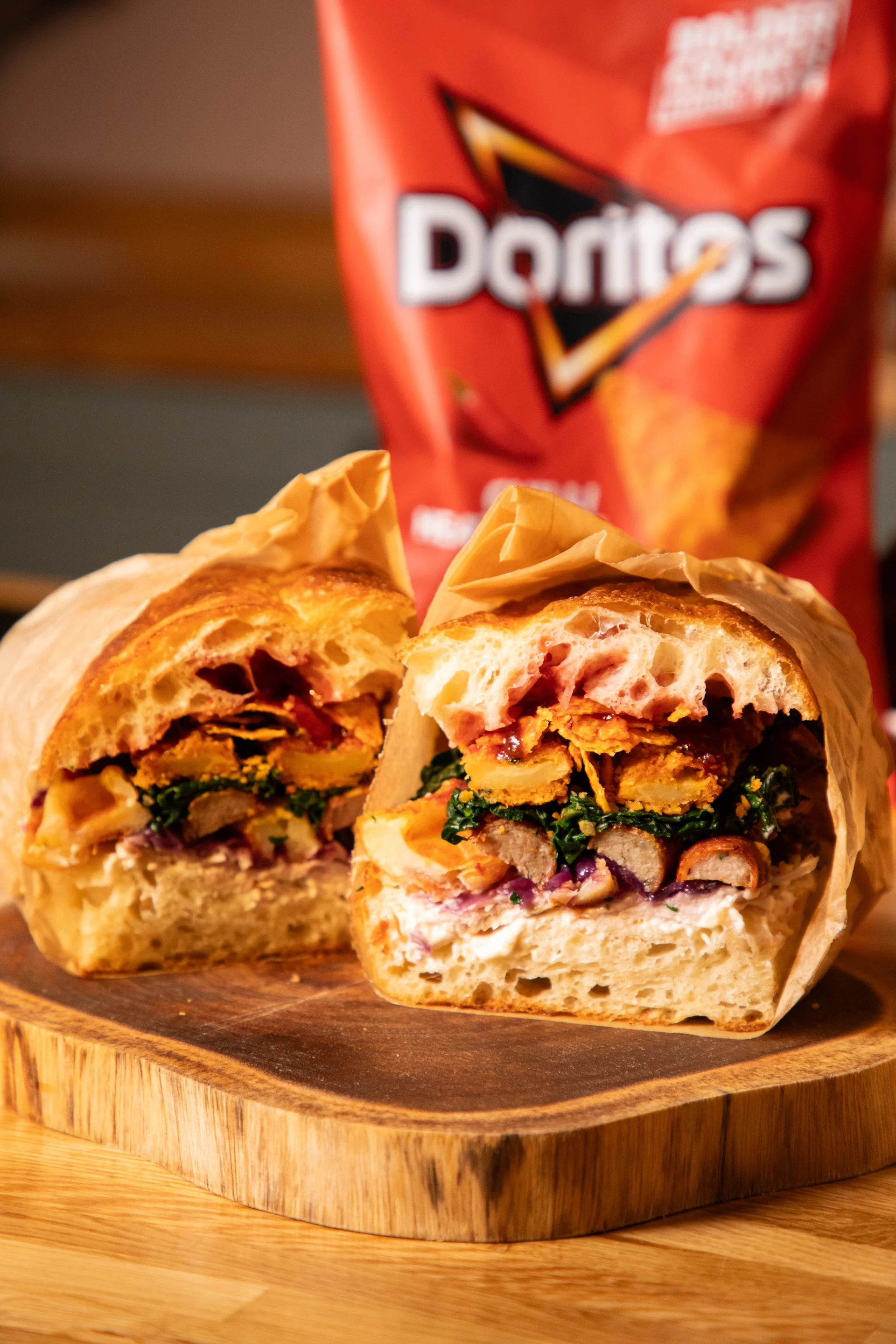 Start building your sandwich - spoon on some mayonnaise, followed by plenty of sliced Turkerito (recipe here) and red cabbage. Place your potato waffle on top, then all the pigs in blankets, cavolo nero and Doritos Chilli Heatwave. Spread the top slice of focaccia with the cranberry sauce and cut it into your desired sandwich size. Wrap in baking paper and tie with a festive bow before unwrapping at your leisure. Merry Christmas!