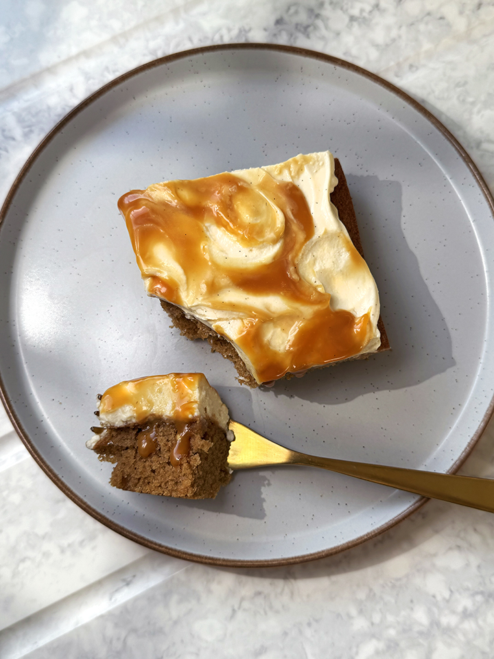 The most indulgent coffee cake, it's basically a vanilla latte in sponge form. Soft, moist slabs of coffee cake topped with a light and fluffy mascarpone coffee cream and sea salted caramel swirls.