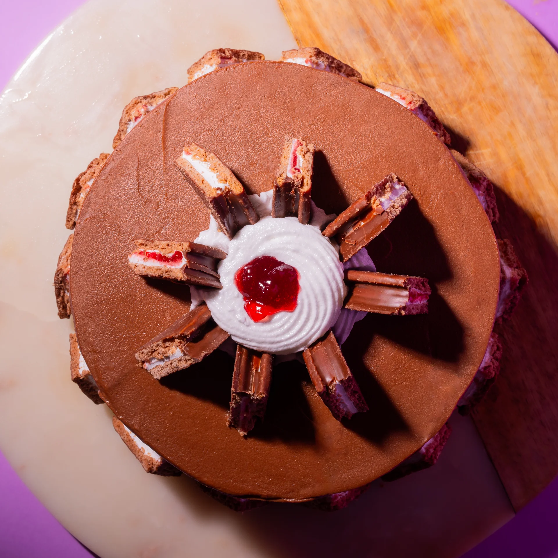 Remember Wagon Wheels? Those big round chocolate disks of jammy heaven? We're taking that hometime treat and turning it on it's head - literally. A vertical roll up cake filled with marshmallow frosting and fresh raspberry jam? That's enough to make anyone's inner child happy!